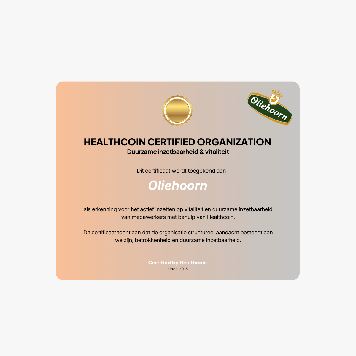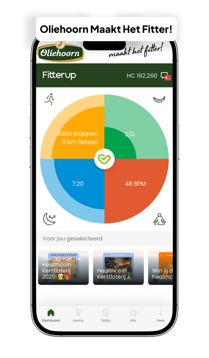 In 2022 volgt de grootste verandering, als Oliehoorn start met Healthcoin. ‘We wilden graag een compleet programma aanbieden aan onze medewerkers’, zegt Arjan Dijk, directeur van Oliehoorn. ‘Een programma dat niet alleen draait om sport en bewegen, maar ook om voeding, slaap en mentale gezondheid. Healthcoin sloot daar mooi bij aan.’ Medewerkers die eraan meedoen – dat gebeurt op vrijwillige basis – kunnen via een activity tracker en de FitterUp app deelnemen aan challenges op het gebied van bewegen, voeding, slaap of mentale gezondheid. Elk behaald doel wordt beloond met healthcoins, waarmee deelnemers vervolgens gezonde producten kunnen aanschaffen.